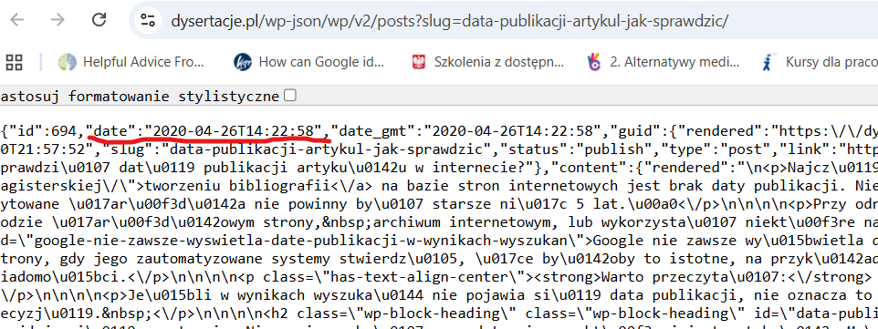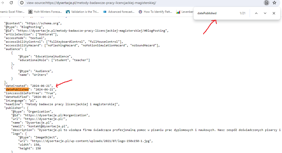 Wiele stron ma też wdrożone dane strukturalne schema. To standard, z którego korzystają roboty wyszukiwarek (JSON-LD) i jest najbardziej precyzyjny. Aby to sprawdzić, w wyszukiwarce wpisz „datePublished„: