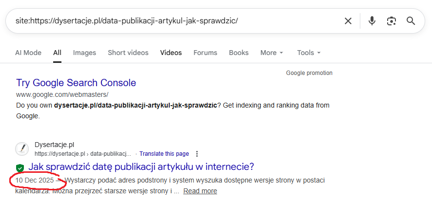 cache:https://dysertacje.pl/data-publikacji-artykul-jak-sprawdzic/ (w przypadku tej strony taki wynik nic nie zwróci). - Zatwierdź Enterem.